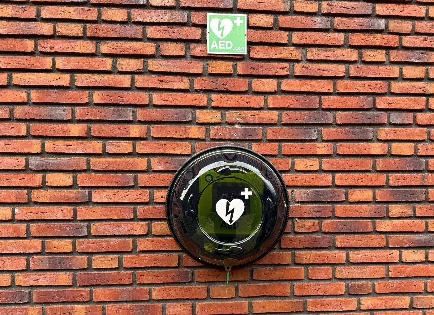 - De AED-kast hangt aan de muur bij de hoofdingang van het Medisch Centrum